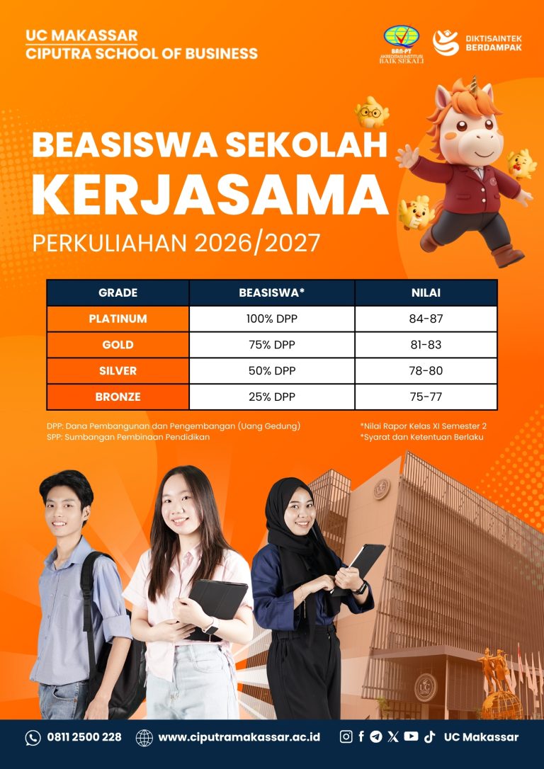 Beasiswa ini merupakan beasiswa untuk semua Sekolah Kerjasama UC Makassar, didapatkan sesuai nilai rata-rata rapor lolos tes seleksi (kuota terbatas)